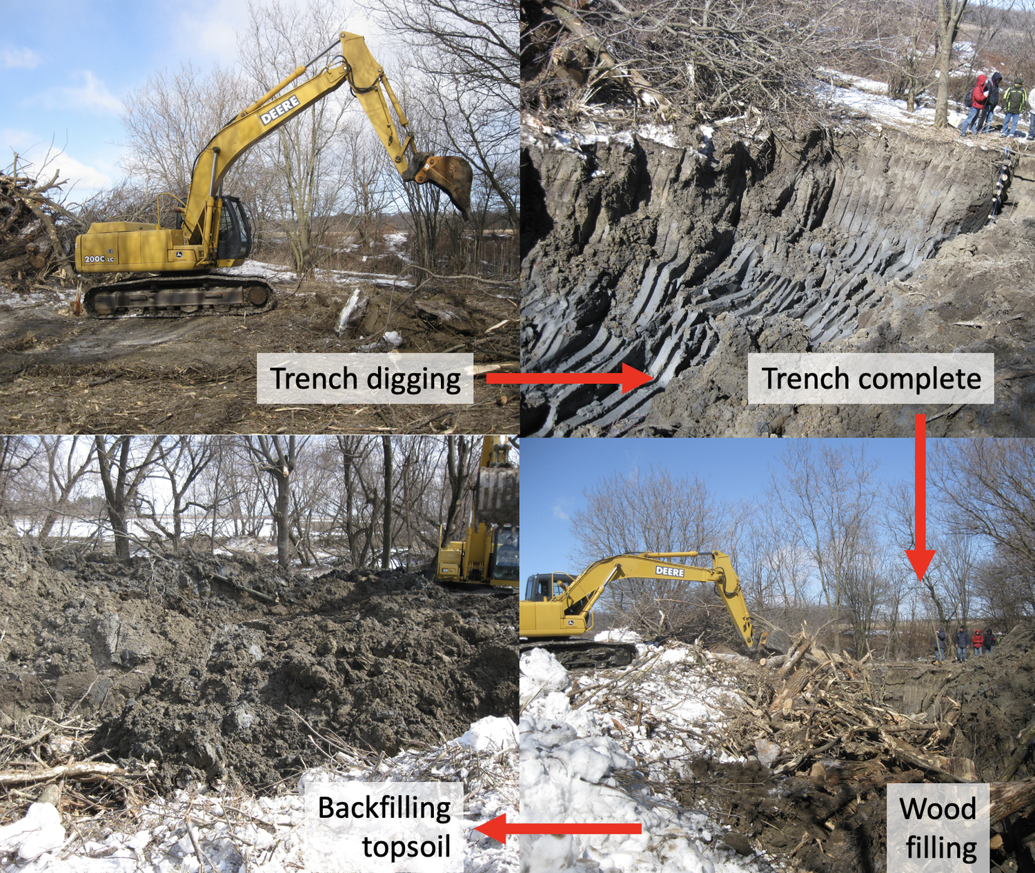 In March 2013, at the corner of an agricultural field near Montreal, Canada, 35 tons of unwanted wood collected in the surrounding region was buried in an excavated trench. Grass has since grown back on the surface. Nearly 9 years later, sample wood discs were excavated for physical and chemical analysis. The results show convincingly the high durability of buried wood. The operation was low-cost and highly scalable. See results at This is CDR presentation Episode 24.